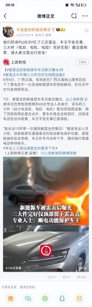 据比亚迪集团品牌及公关处总经理李云飞微博透露,核心零部件如电池、电机、电控三大件均完好无损。除顶部有两处雷击点,整车外观也没有损坏,在实际应用中展现出优异的安全性。