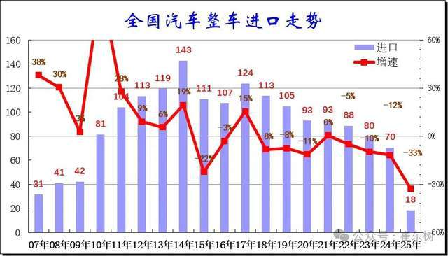 崔东树表示,在2014年进口车达到143万辆峰值后下行,2016—2017年进口增速稍有企稳改善,2018年以来至今持续下滑。2024年进口规模持续锐减,全年进口仅有70万辆,同比下降12%。目前进口车持续萎缩压力仍较大。