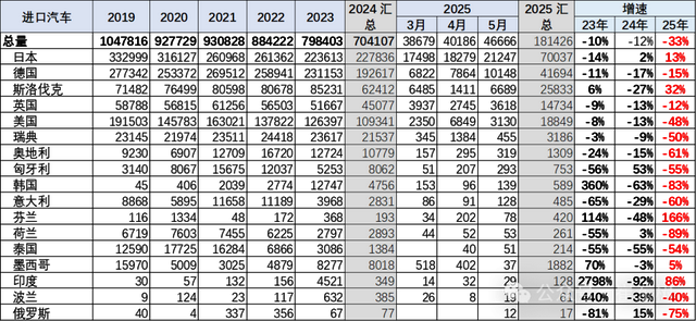 今年1—5月进口汽车位居前五的来源国是:日本(70037辆)、德国(41694辆)、斯洛伐克(25833辆)、美国(18849辆)、英国(14734辆)。其中,美国进口车数量跌幅明显,从2017年的28万辆降至2024年的10.9万辆,2025年前五个月进一步萎缩至1.88万辆。