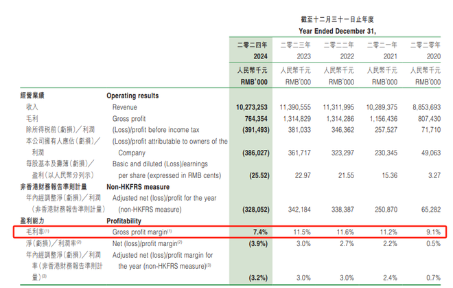 “性价比”一词在百果园2024年财报中出现了25次。推“性价比”的结果之一,就是侵蚀利润空间。年报显示,2024年,百果园的毛利率为7.4%,比2023年的11.5%下降了4.1个百分点。