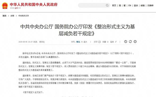 8月6日,中共中央办公厅、国务院办公厅印发了《整治形式主义为基层减负若干规定》(以下简称《若干规定》)。该文件提出了切实精简文件、严格精简会议、统筹规范督查检查考核、规范借调干部、规范政务移动互联网应用程序管理、规范明晰基层权责、规范创建示范和达标活动等七个方面要求。