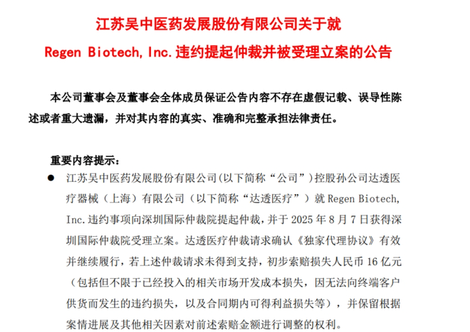 8月11日消息,今日,*ST苏吴(600200.SH)公告称,公司控股孙公司达透医疗器械(上海)有限公司(下称“达透医疗”)就Regen Biotech, Inc.违约事项向深圳国际仲裁院提起仲裁,并于2025年8月7日获得受理立案。达透医疗请求确认《独家代理协议》有效并继续履行,若未得到支持,初步索赔损失人民币16亿元,并保留根据案情进展及其他相关因素对前述索赔金额进行调整的权利。