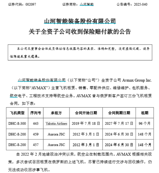 3架租出去的飞机滞留俄罗斯后,山河智能终于收到了保险赔偿金。
