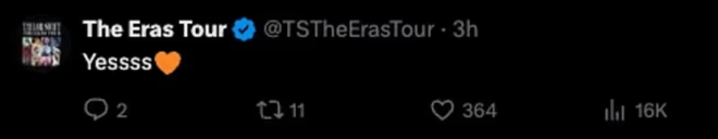 (霉霉的“时代巡演”官方账号随即用“Yessss”回应,并配橙色心形。)