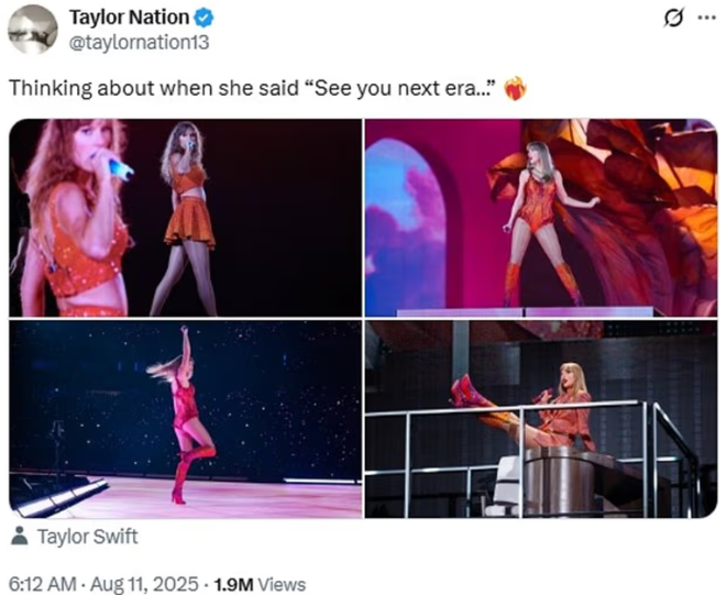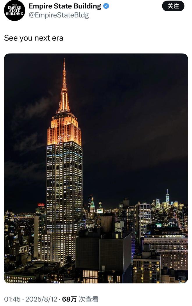当地时间8月11日,帝国大厦官方X账号发布一张顶部被橙色灯光照亮的照片,并配文“See you next era(下个时代见)”。霉霉的“时代巡演”官方账号随即用“Yessss”回应,并配橙色心形,引发粉丝热议,认为这是TS12的预热。斯威夫特上一次发片是2024年4月的《The Tortured Poets Department》。