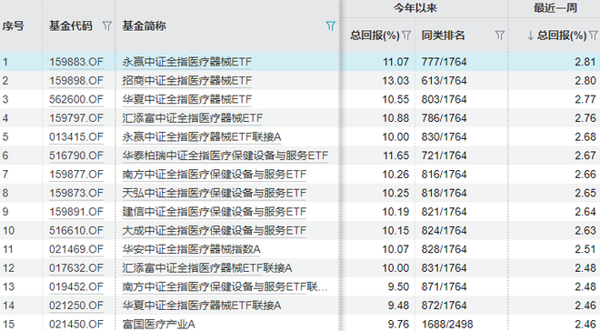 Wind数据显示,截至8月11日晚,永赢医疗器械ETF、招商医疗器械ETF、华夏医疗器械ETF、汇添富医疗器械ETF这4只医疗器械ETF近一周分别上涨2.81%、2.80%、2.77%、2.76%,领涨医药板块。