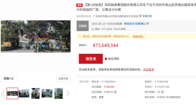 6月26日消息,6月25日,赫美集团(002356.SZ)公告称,公司名下位于深圳市南山区侨城北路高发东方科技园的厂房、公寓合计90套房产已完成拍卖,最终由深圳市尧庆新材料科技有限公司以7364.93万元竞得。此次拍卖标的评估价值为11507.71万元,经过三次拍卖,最终成交价为7364.93万元。