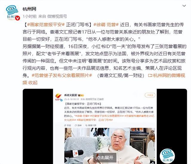 另据据第一财经报道,16日深夜,小红书ID“范一夫”的账号发布了三张范曾看展的照片,配文“老爷子来看画展”,发文地点显示为法国,被外界视为对近日有关范曾传闻的一种回应。但文中未注明“看画展”的时间。该账号分享多为艺术品欣赏和旅行观光内容,也有一些范一夫作品展览信息,知名艺术主编、策展人在评论区现身。