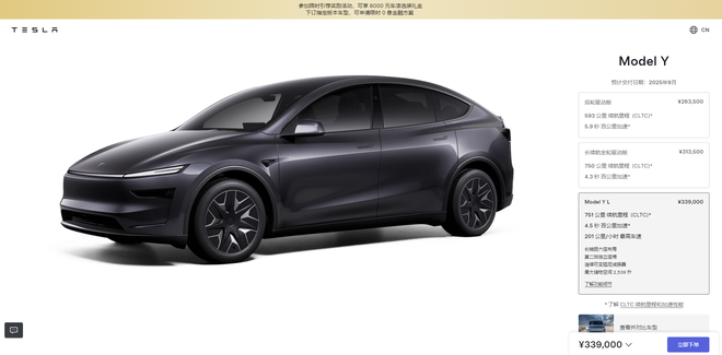 8月19日,特斯拉中国官网上线Model Y L车型,33.9万元起售,预计交付时间为9月。目前官网仅上线了售价33.9万元的单一配置版本。
