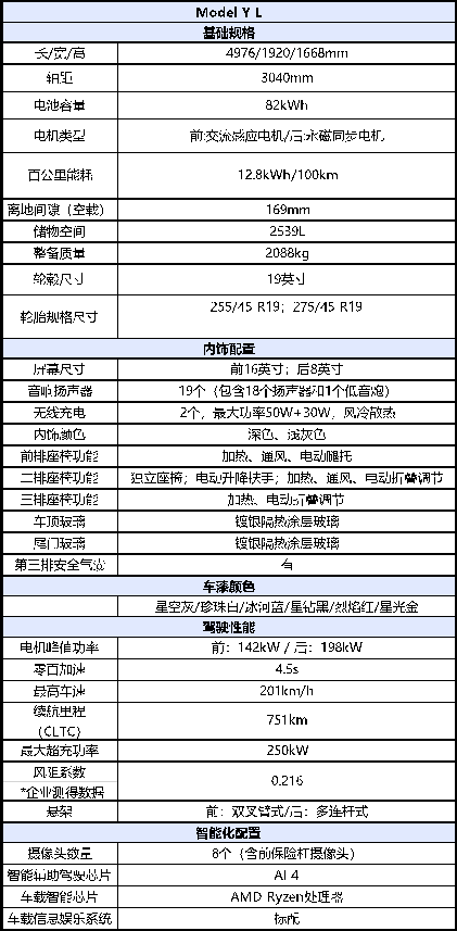 性能方面,Model Y L搭载双电机全轮驱动系统,百公里加速仅需4.5秒;配合82kWh三元锂电池,最长续航里程可达751km。