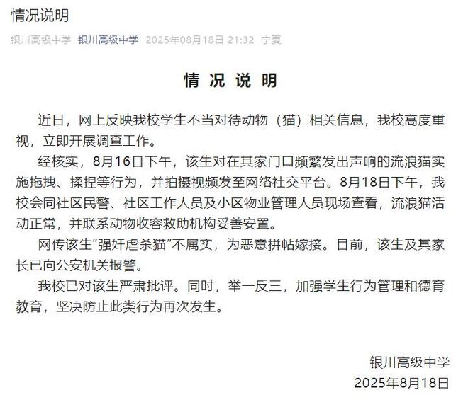银川高级中学回应“学生拖拽流浪猫”:网传“虐杀猫”不属实,为恶意拼接