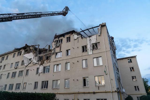 当地时间8月18日,乌克兰哈尔科夫一处居民楼遭俄罗斯导弹袭击。图/视觉中国