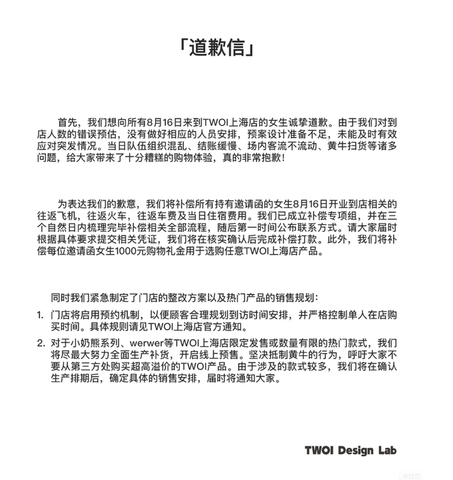 注意到,8月18日,TWOI在其小红书官方账号公布了道歉信、门店整改方案以及热门产品销售规划。品牌表示,上海门店后续将启用预约机制,对于热门款式将开启线上预售。