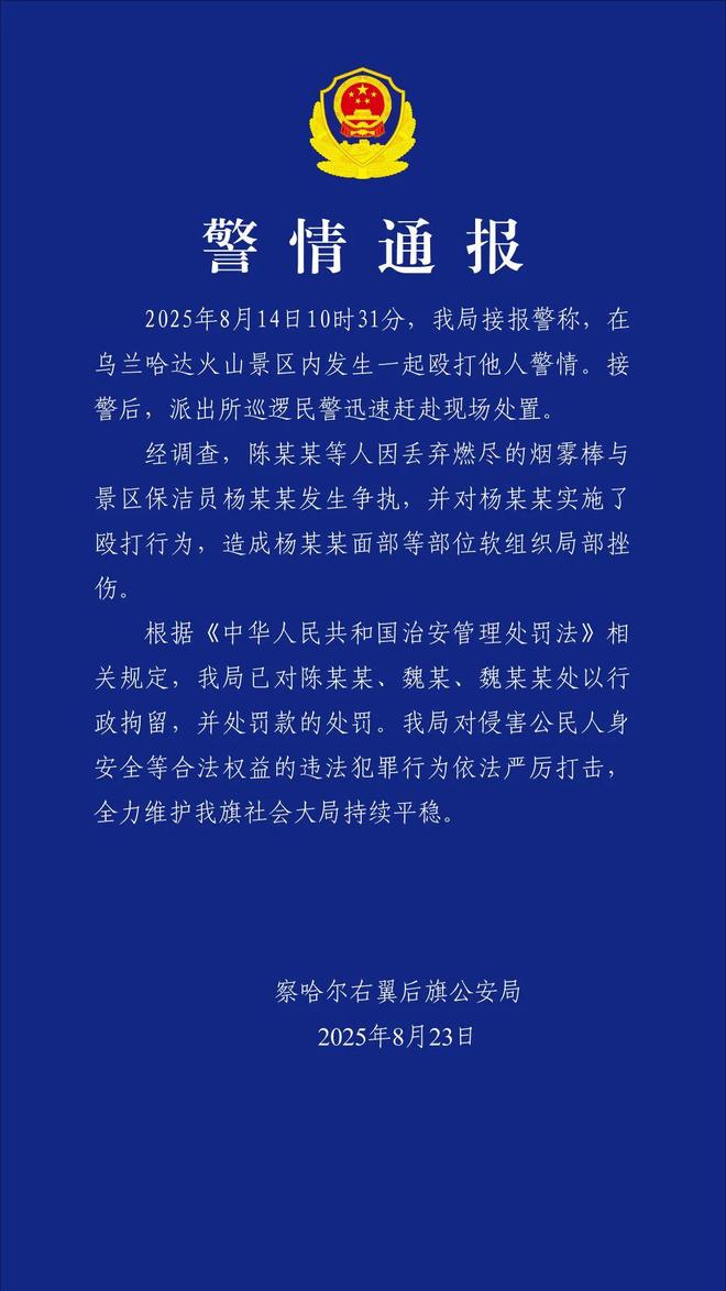 内蒙古某景区发生保洁员遭多名游客殴打事件,警方已经介入调查并通报处理结果,据警方通报,陈某某、魏某和魏某某等涉案人员被行政拘留并罚款,事件引起了社会广泛关注,呼吁加强旅游景区管理,保障工作人员权益,同时呼吁游客文明旅游,尊重他人劳动成果。