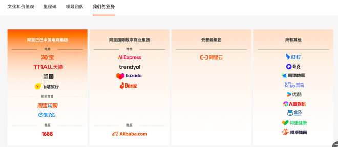 8月24日消息,阿里巴巴集团官网显示,其原有的六大业务集团被划分为四大业务类别,分别为阿里巴巴中国电商集团、阿里国际数字商业集团、云智能集团以及所有其他业务。