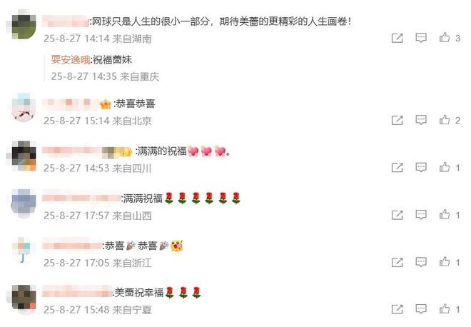 网友纷纷在评论区留言送祝福:“网球只是人生的很小一部分,期待美蔷的更精彩的人生画卷!”“美蔷祝幸福”。