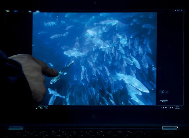 上图:2022年6月7日,工作人员在播放“深蓝1号”网箱水下画面,网箱中大概有10万尾的大西洋鲑。图/新华