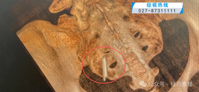 从医生给胡女士做的CT影像中可以清晰地看到,在胡女士盆骨后方,悬浮着一截2公分左右长的异物。据胡女士介绍,前不久她骑自行车摔了一跤,担心骶骨骨折。在做三维CT检查后,医生发现了这个异物。经过再三回忆,胡女士想起22年前,当时她正在上小学,而同桌男生在把玩一截温度计。