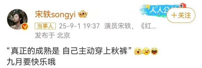 9月1日晚,宋轶在个人社交平台发视频并配文,真正的成熟是自己主动穿上秋裤,IP显示在北京。