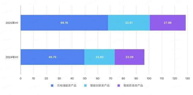 其中,充电储能类产品仍贡献最多营收(占比52.97%),包括充电宝、充电器、充电线等数码充电产品,以及便携、户用等消费级储能产品,共收入68.16亿元,同比增长37%。