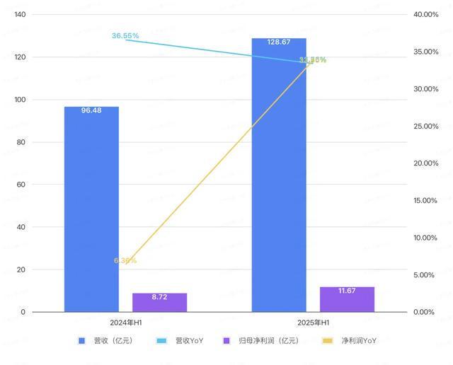 今年上半年,其营收同比增长33.36%至128.67亿元,这也是其半年营收首次突破百亿。同时,其归母净利润达11.67亿元,33.80%的同比增速远超去年同期的6.36%。