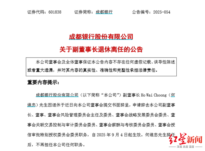 成都银行副董事长退休离任 系马来西亚籍任职17年,成都银行马来西亚籍副董事长退休离任,任职长达17年