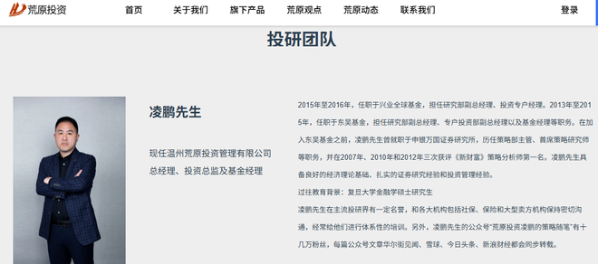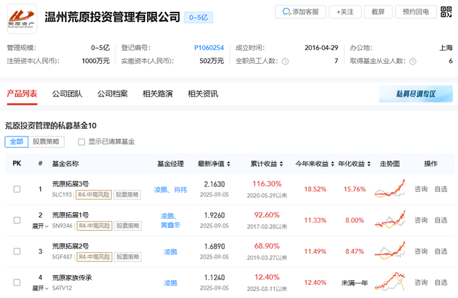 中基协网站信息公示,荒原投资全称“温州荒原投资管理有限公司”,成立于2016年4月29日,在管基金数量为6只,规模为0-5亿元。凌鹏是该私募的法定代表人、董事长、总经理、基金经理,持股比例为99%。