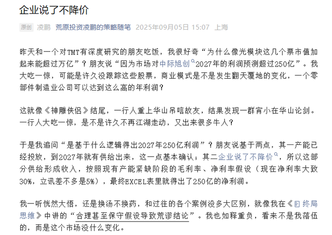 9月5日,荒原投资董事长凌鹏公开质疑市场对中际旭创2027年净利润超过250亿元的预测,引发广泛关注。