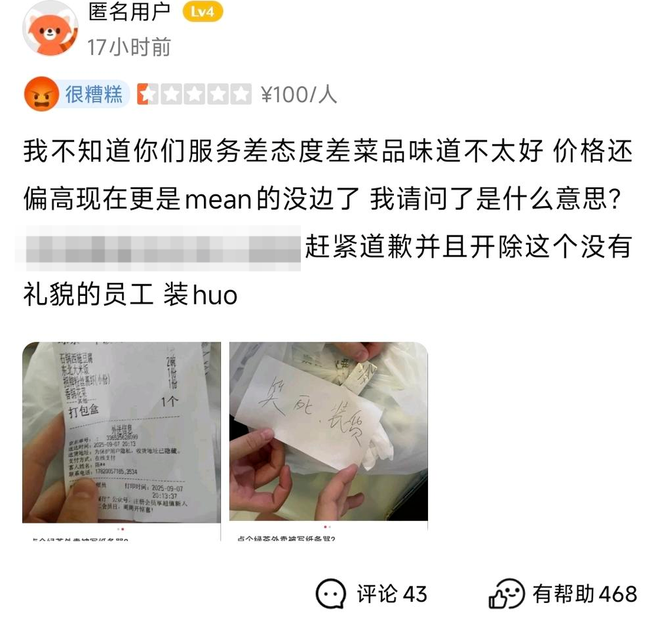 注意到,事件发酵后,绿茶餐厅东莞国贸店在大众点评平台上新增差评,并引发43条评论。消费者表示,“居然还要专门写个纸条骂人”“绿茶餐厅避雷了”。