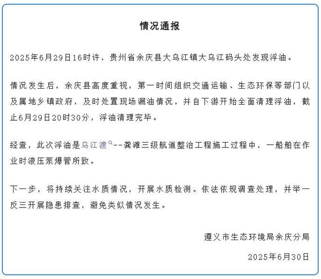 2025年6月29日16时许,贵州省余庆县大乌江镇大乌江码头处发现浮油。