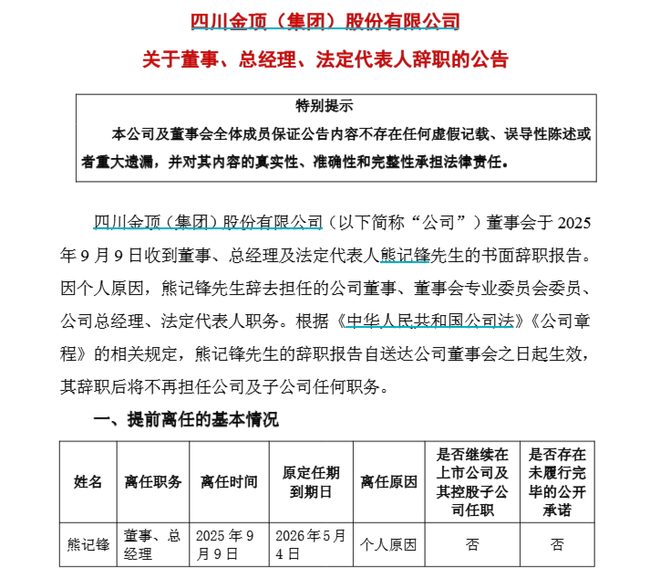 微成都报道9月9日晚,四川金顶(600678.SH)公告,公司董事会收到董事、总经理及法定代表人熊记锋的书面辞职报告。