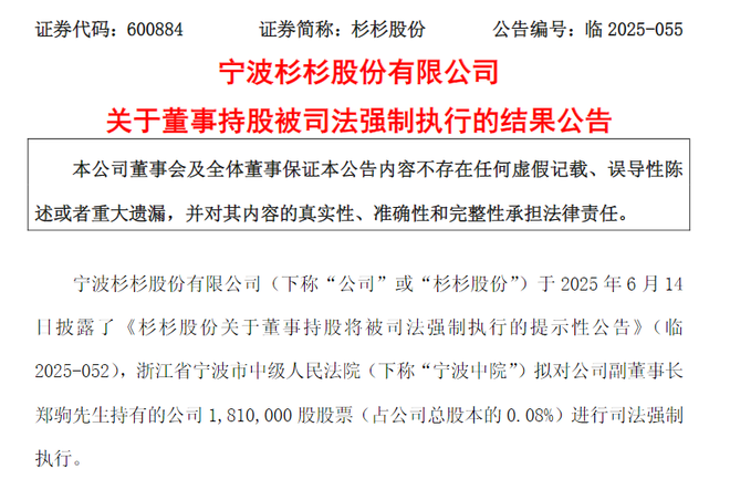 6月29日消息,杉杉股份(600884.SH)6月27日发布公告,浙江省宁波市中级人民法院拟对公司副董事长郑驹持有的公司181万股股票(占公司总股本的0.08%)进行司法强制执行。本次执行后,郑驹不再持有公司股份。