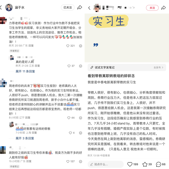 注意到,上述离职感言截图广泛传播后,连日来,有不少曾在中泰证券实习、与周寒阳有过接触的网友在社交平台上留言评论。有人表示,周寒阳“很有耐心、很细心,愿意给新人机会”、“为数不多能把实习生当学生的前辈”,还有人认为他“一定会成为卓越的老师”,并祝他前程似锦。