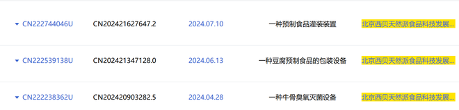 查询国家知识产权局发现,该公司在2024年申请了与预制食品相关的专利,分别为一种预制食品灌装装置、一种豆腐预制食品的包装设备、一种牛骨臭氧灭菌设备。
