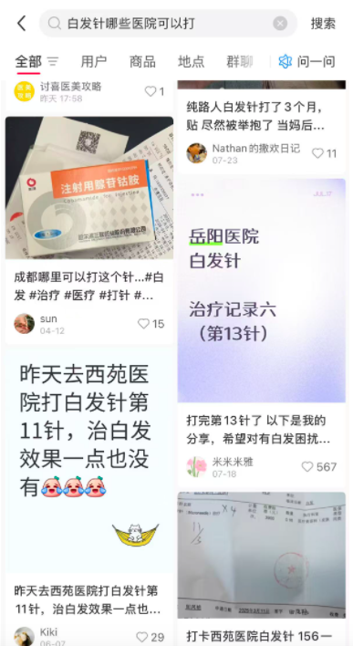 在小红书“白发针”词条的下游搜索词中,“白发针哪些医院可以打”排在第5位,关联阅读量超过271万。