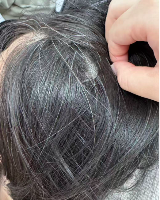 两个月后,夏微发现头顶的白发有一些微妙的变化。“偶尔能看到几根纯白的头发发根处转黑了”,但对顽固的白发,效果有限。她决定继续打针治疗,希望能缓解白发新增,又增加了一个疗程。
