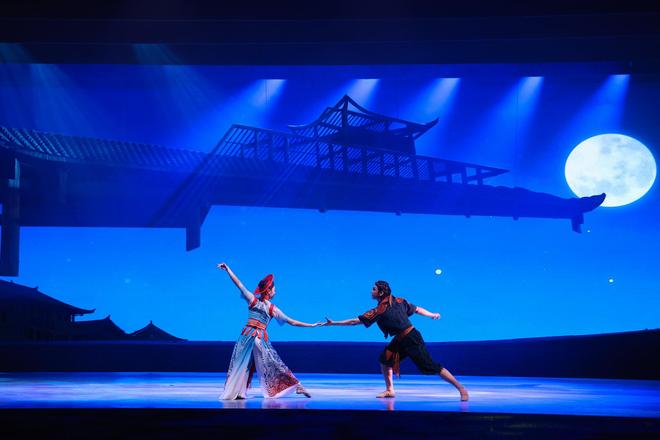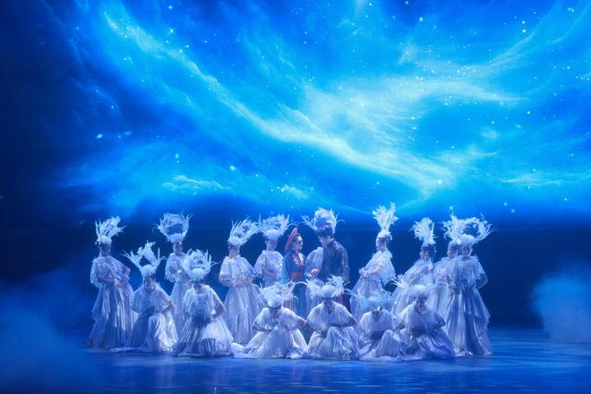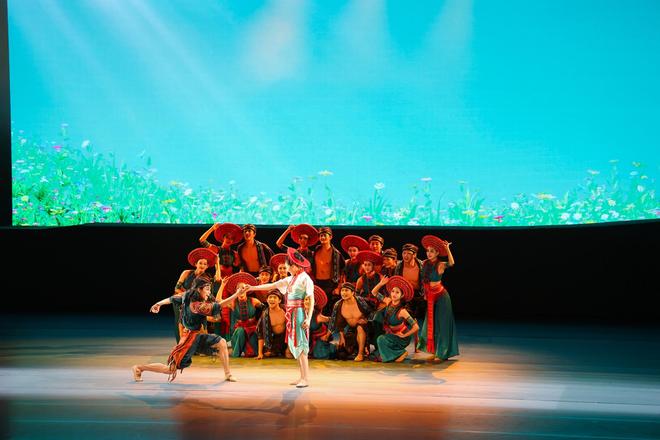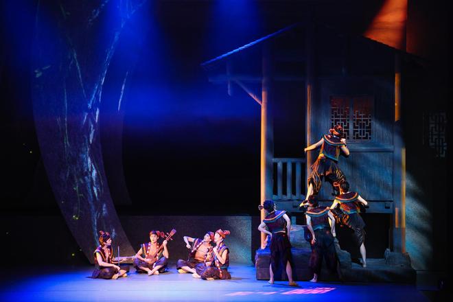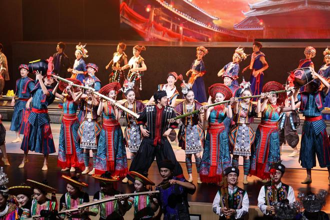 序幕之后,春夏秋冬四幕铺陈开来。春天,伴随苗族歌鼟与沅水号子,耕作的人们在梯田中播种,肌肤在汗水下闪烁古铜光泽。小阿禾在花瑶梯田嬉戏,与怀生远远相望,童年的缘分如春风拂面;夏天,花瑶挑花、摸鱼、爬花楼、弹牛腿琴与唱琵琶歌相结合,花瑶少女的刺绣技艺成为青春情感的象征,传统民俗与现代舞肢体交织,民族韵律与生活美学在舞台上复苏;秋天的婚礼场景,侗歌瑶舞、芦笙踩堂、多耶舞轮番上演,媒公抓鸡、隔桌饭、蹾屁股等民俗礼仪被艺术化呈现,既尊重传统,又赋予现代观众沉浸式体验;冬天,侗族冬祭、瑶族织锦、苗族古歌构成“雪夜对歌”“织锦传情”“白头盟誓”的核心场景,展示爱情的长久与文化的延续。