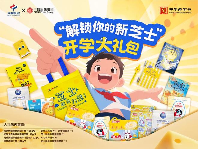 值得一提的是,本届上海书展的墨香中还藏着一份甜蜜彩蛋——光明乳业与中信出版集团联合推出的“解锁你的新芝士,限定开学大礼包”。礼包包含光明再制干酪等经典乳品,搭配新芝士文具笔、笔记本、主题贴纸和NFC有声书卡等,让精神食粮与味蕾满足同频共振。