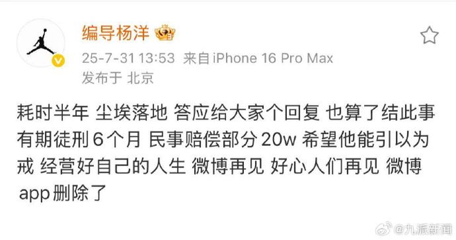 7月31日,李明德砸车事件迎来新进展。车主编导杨洋发文称:“耗时半年,尘埃落地,答应给大家个回复,也算了结此事。有期徒刑6个月,民事赔偿部分20w,希望他能引以为戒,经营好自己的人生。”