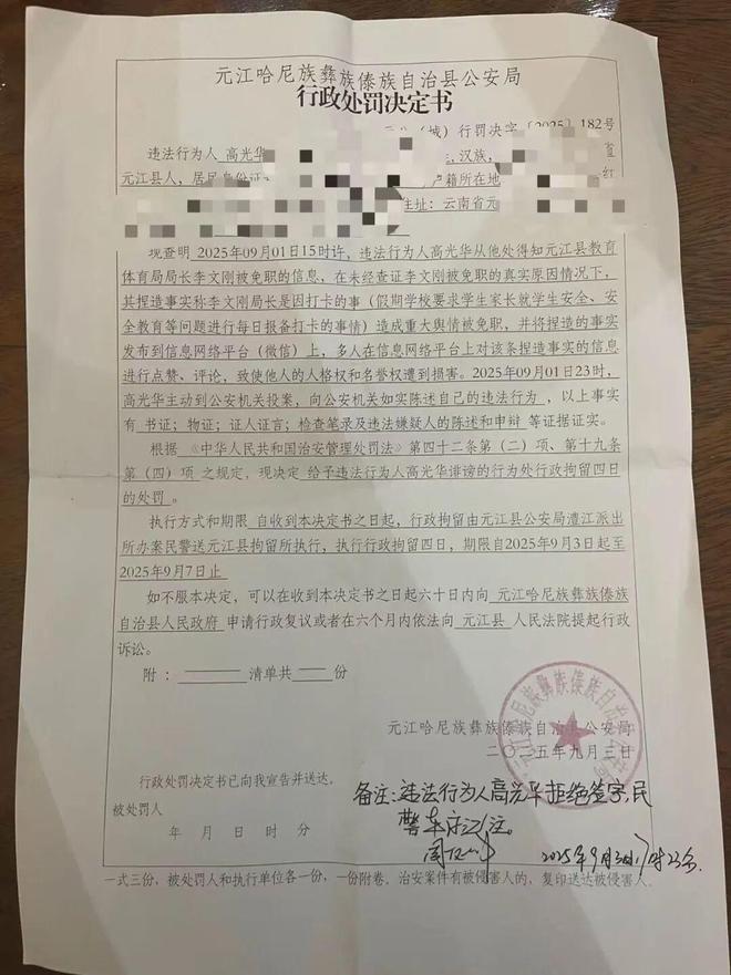 9月3日早上8时许,辖区派出所通知他,已向元江县组织部和纪委调取资料确认:李文刚的免职与打卡的事情无关,认定高光华“公然侮辱他人或者捏造事实诽谤他人”,处以行政拘留4天。