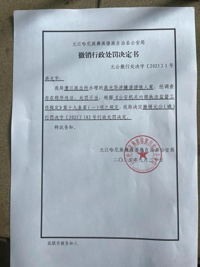 9月20日,高光华收到了元江县公安局的《撤销行政处罚决定书》。《撤销行政处罚决定书》显示,澧江派出所办理的高光华涉嫌诽谤他人案,经调查存在程序违法,处罚不当,根据《公安机关内部执法监督工作规定》第十九条第一(项)之规定,决定撤销相关行政处罚决定。