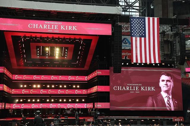 当地时间2025年9月21日,美国亚利桑那州农业体育场,查理·柯克悼念活动舞台。图/视觉中国