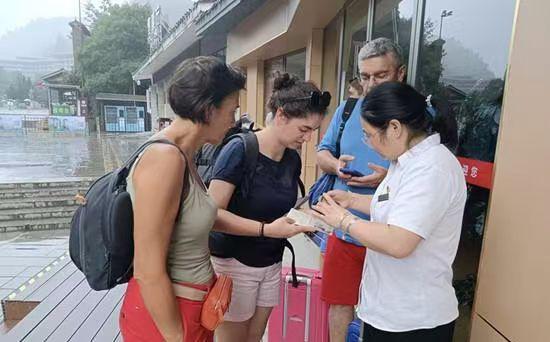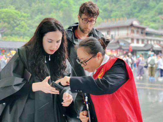 暑期旅游旺季在索溪峪景区水绕四门景点,54岁的老职工符佑明在景区导览图前用外语向外国游客指引线路,提供导览服务,“从没想过有一天我也能和外国友人对话。”他说。