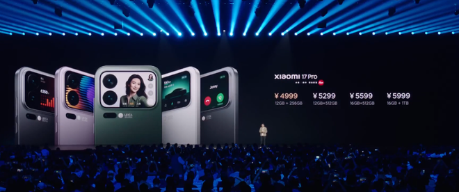 小米17 Pro 12GB+256GB售价4999元,12GB+512GB售价5299元,16GB+512GB售价5599元,16GB+1TB售价5999元。