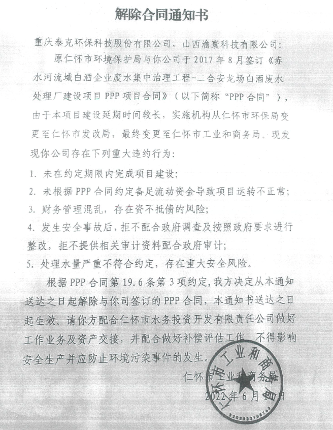 据《复查意见书》,2022年5月19日,仁怀市安龙场废水处理安全事故发生后,仁怀市成立联合工作组进驻安龙场废水处理厂。6月6日,工作组发现重庆泰克仍未整改安全隐患,造成大量污水无法处理,大部分酒企停产。6月9日,明确由仁怀市水务投资开发有限责任公司,按现状接管安龙场废水处理厂,同时向重庆泰克发送解除合同通知书。