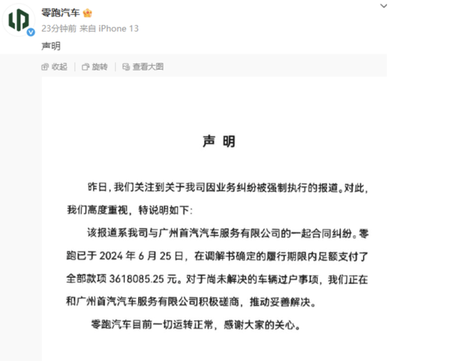零跑已于2024年6月25日,在调解书确定的履行期限内足额支付了全部款项3618085.25元。对于尚未解决的车辆过户事项,零跑正在和广州首汽汽车服务有限公司积极磋商,推动妥善解决。零跑汽车表示,目前一切运转正常。