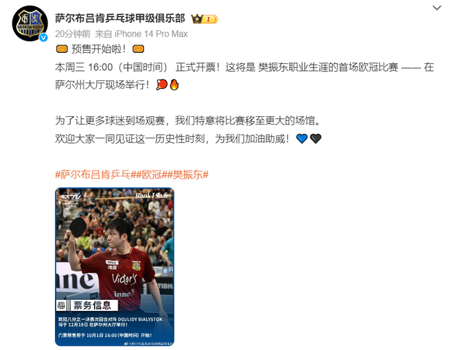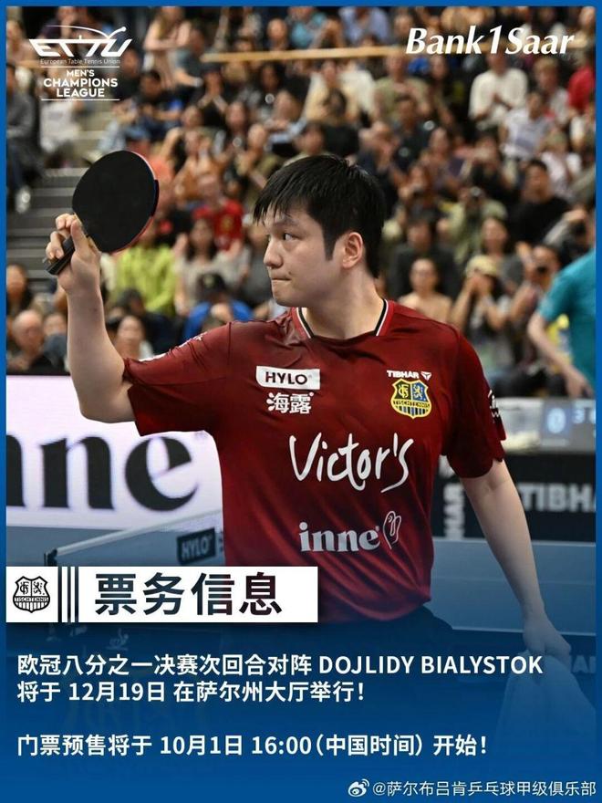 9月29日,萨尔布吕肯俱乐部发文:本周三 16:00(中国时间)正式开票!这将是樊振东职业生涯的首场欧冠比赛 —— 在萨尔州大厅现场举行!
