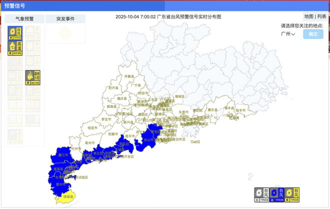 截至10月4日8时,广东徐闻维持发布台风黄色预警信号,湛江其他区域维持发布台风蓝色预警信号;茂名、阳江、江门等地,有市县区发布台风蓝色预警信号;云浮、肇庆、佛山、中山、珠海、广州、东莞、深圳、惠州、汕尾等地,有市县区发布台风白色预警信号。