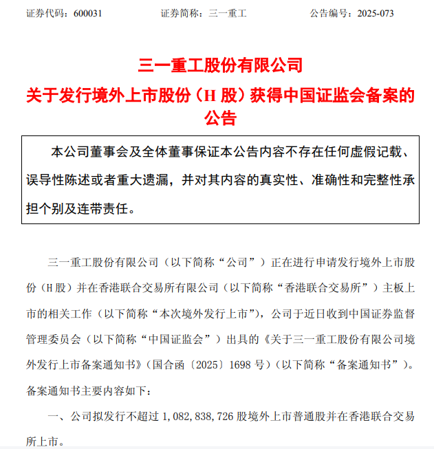 10月8日,三一重工公告称,公司于近日收到了中国证监会出具的《关于三一重工股份有限公司境外发行上市备案通知书》,公司拟发行不超过10.83亿股境外上市普通股并在香港联合交易所上市。![]()