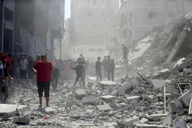 9月15日,巴勒斯坦人在加沙城查看遭以军袭击后的建筑废墟。图/新华